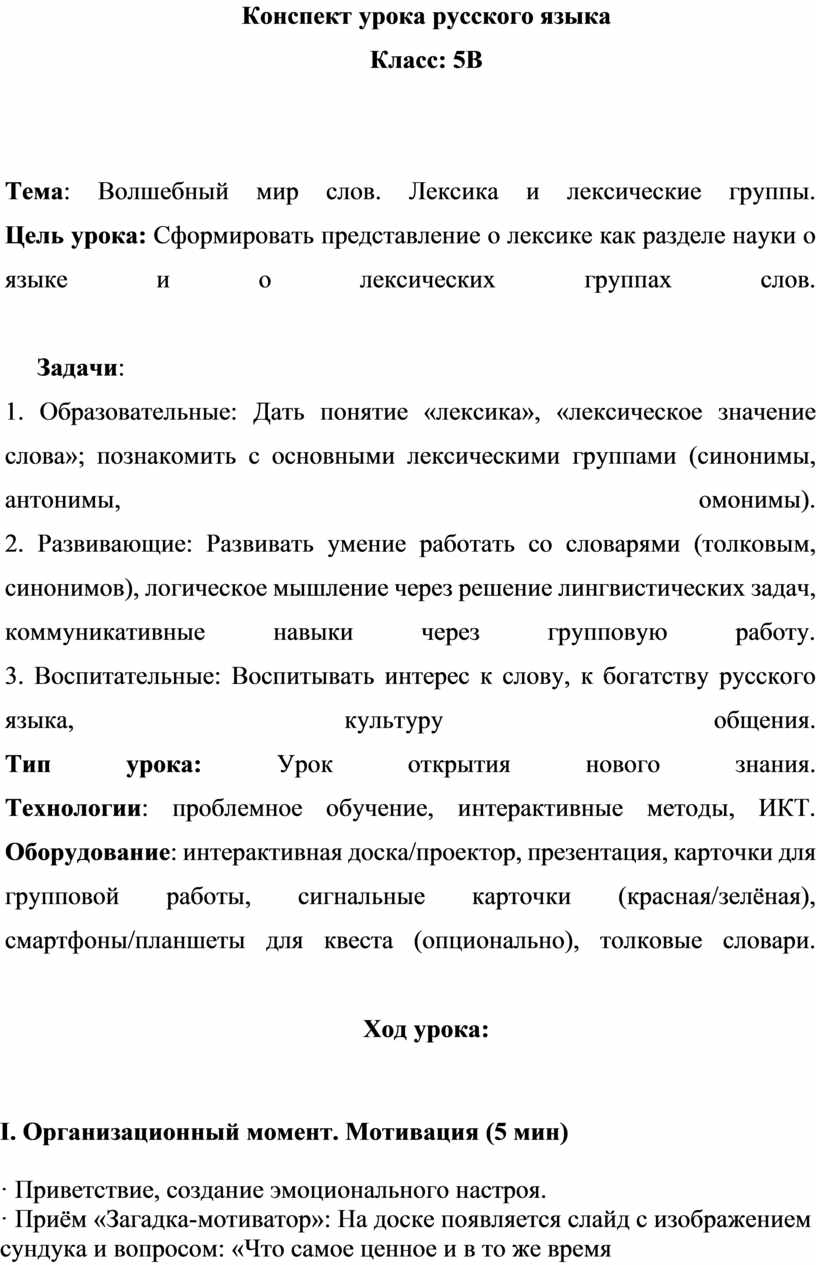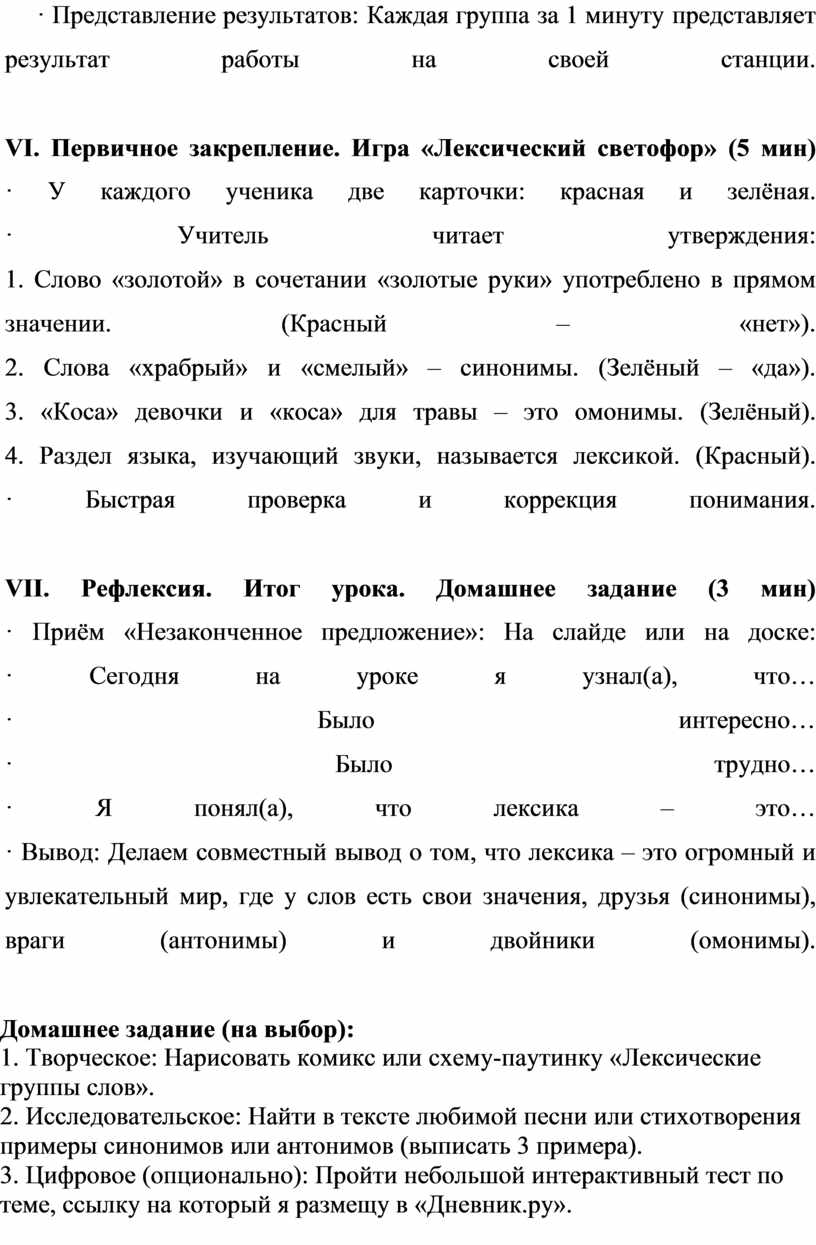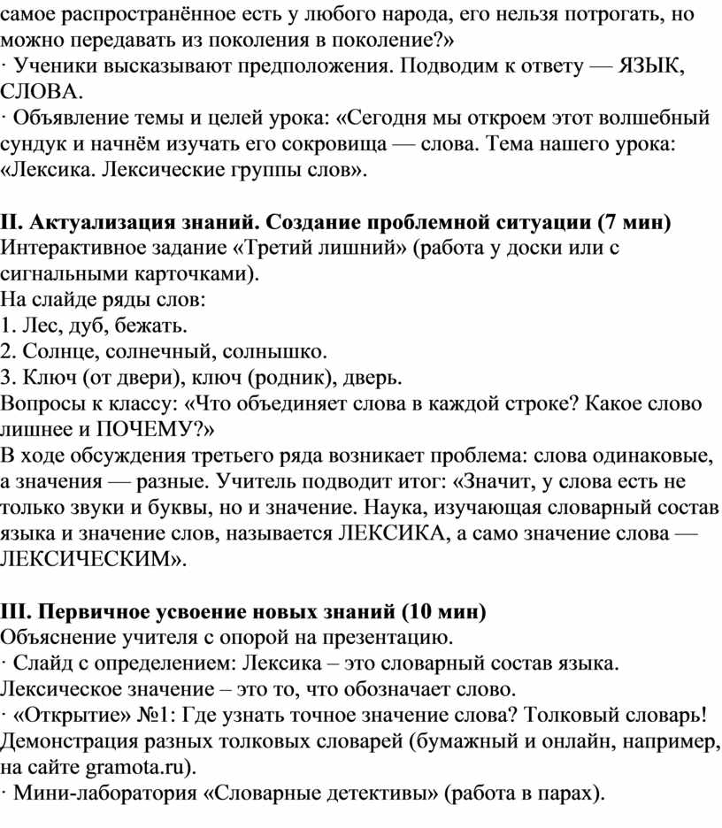 V. Продолжение изучения нового материала. Лексические группы (12 мин)