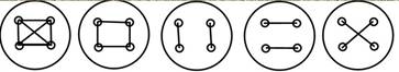 - Сейчас мы знаем, какие бывают виды пуговиц. А вот какими способами их пришивают? Перед вами на доске 5 кружков, изображающих пуговицы с четырьмя отверстиями. Попробуйте соединить эти точки линиями, как будто нитками. Сколько способов вы найдете?