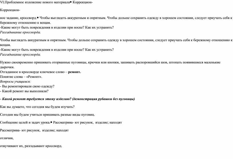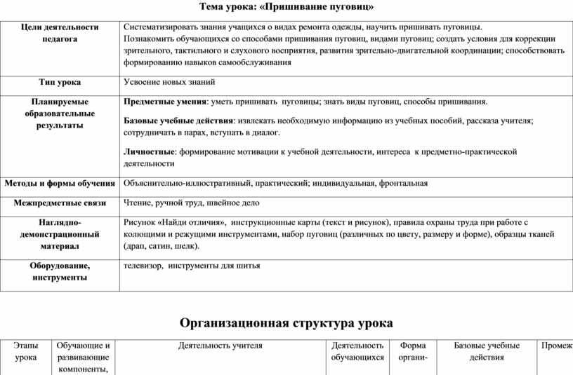 знания учащихся о видах ремонта одежды, научить пришивать пуговицы. |