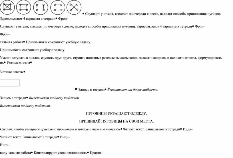 Слушают учителя, выходят по очереди к доске, находят способы пришивания пуговиц. Зарисовывают 4 варианта в тетради |