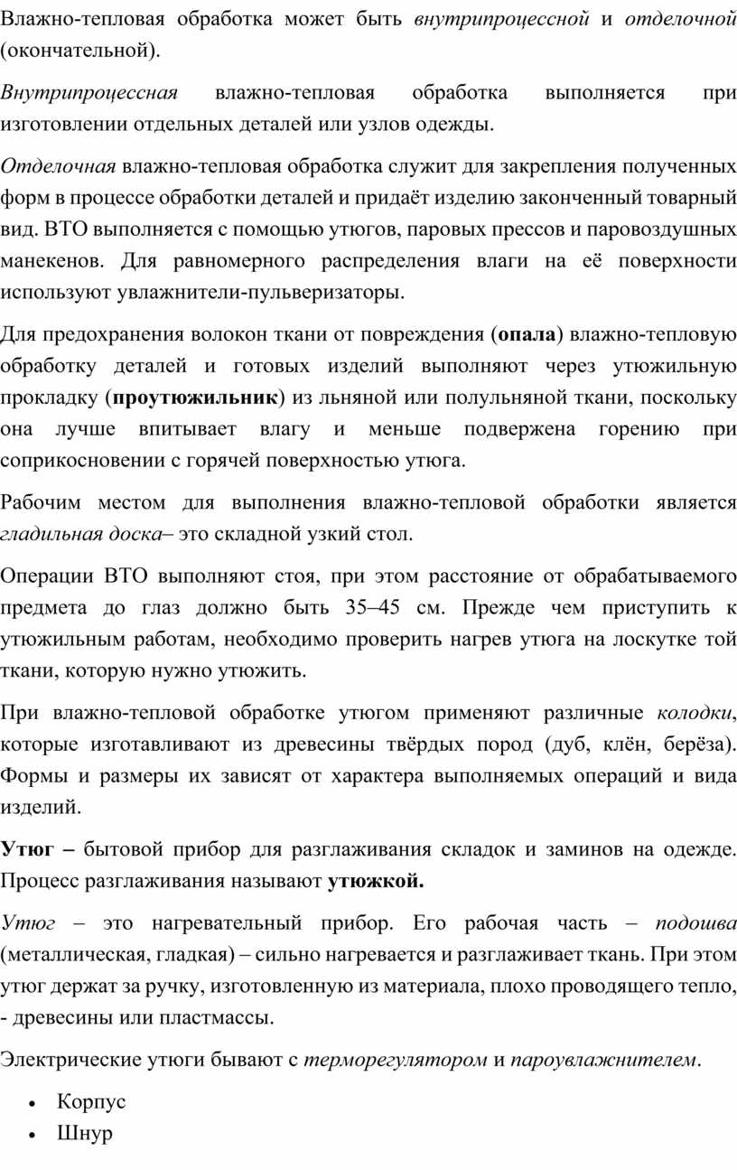 Тема урока: Влажно-тепловая обработка швейных изделий.
