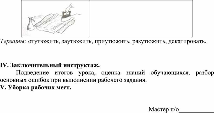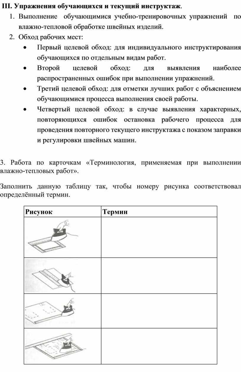 Материально-техническое оснащение: парогенератор, гладильная доска, таблицы с терминологией, образцы машинных швов для ВТО.