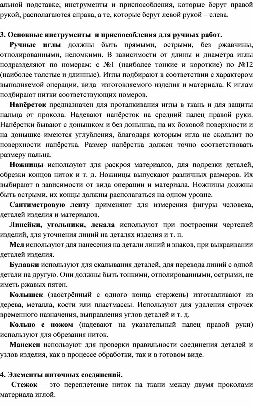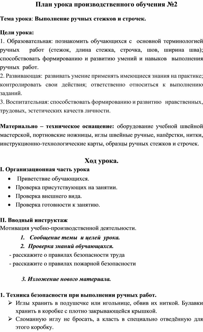Материально – техническое оснащение: оборудование учебной швейной мастерской, портновские ножницы, иглы швейные ручные, напёрстки, нитки, инструкционно-технологические карты, образцы ручных стежков и строчек.