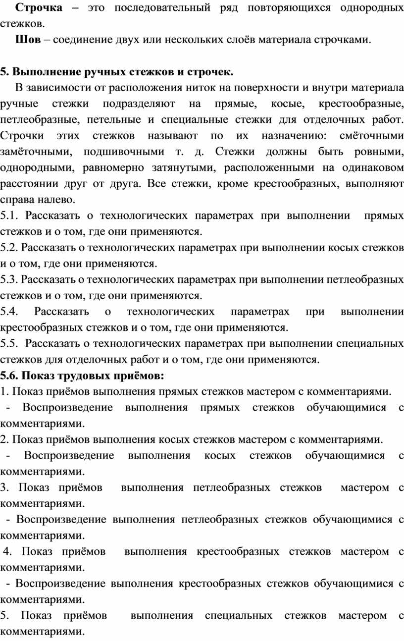 - Воспроизведение выполнения косых стежков обучающимися с комментариями. 3. Показ приёмов выполнения петлеобразных стежков мастером с комментариями.