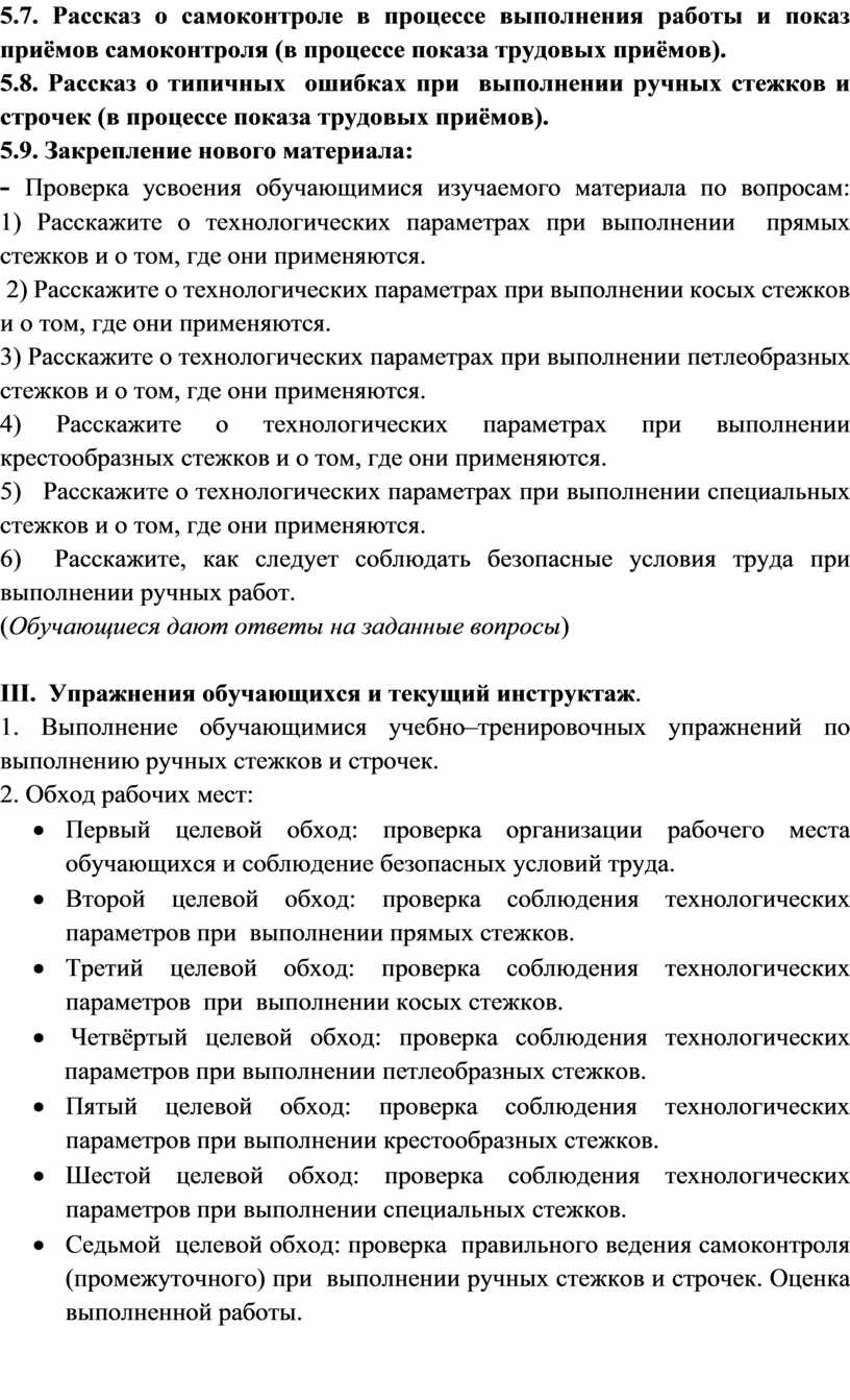 5.7. Рассказ о самоконтроле в процессе выполнения работы и показ приёмов самоконтроля (в процессе показа трудовых приёмов).