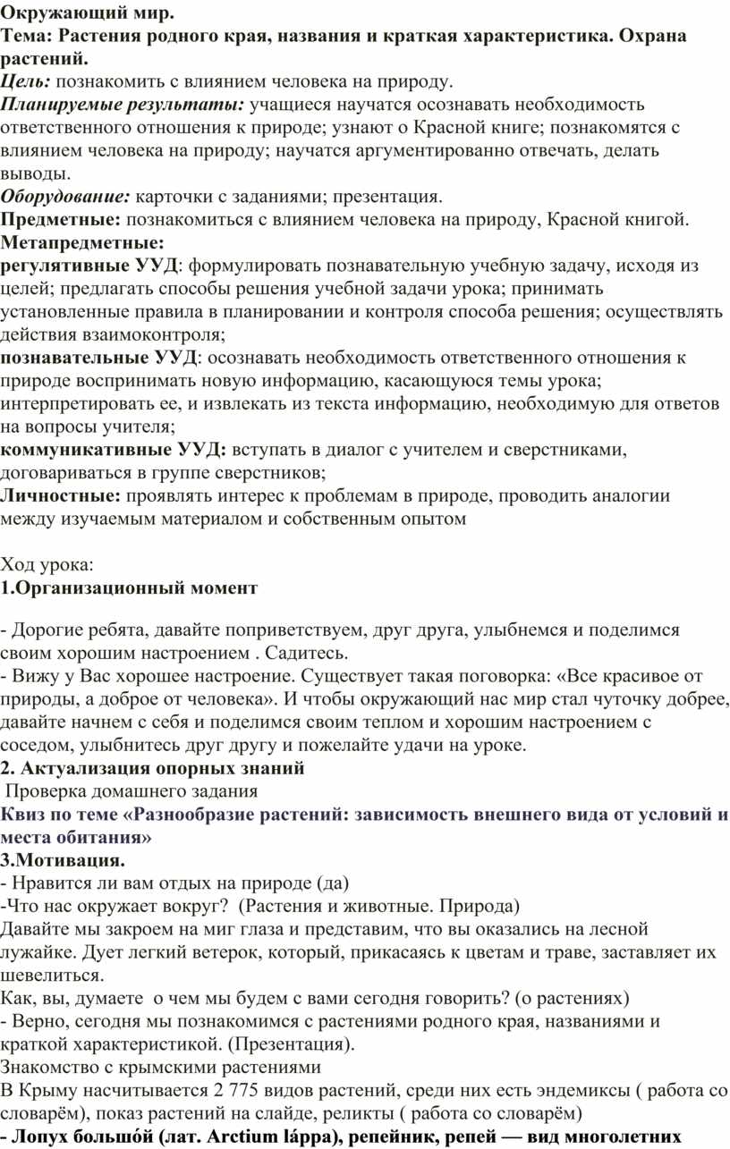 Тема: Растения родного края, названия и краткая характеристика. Охрана растений.