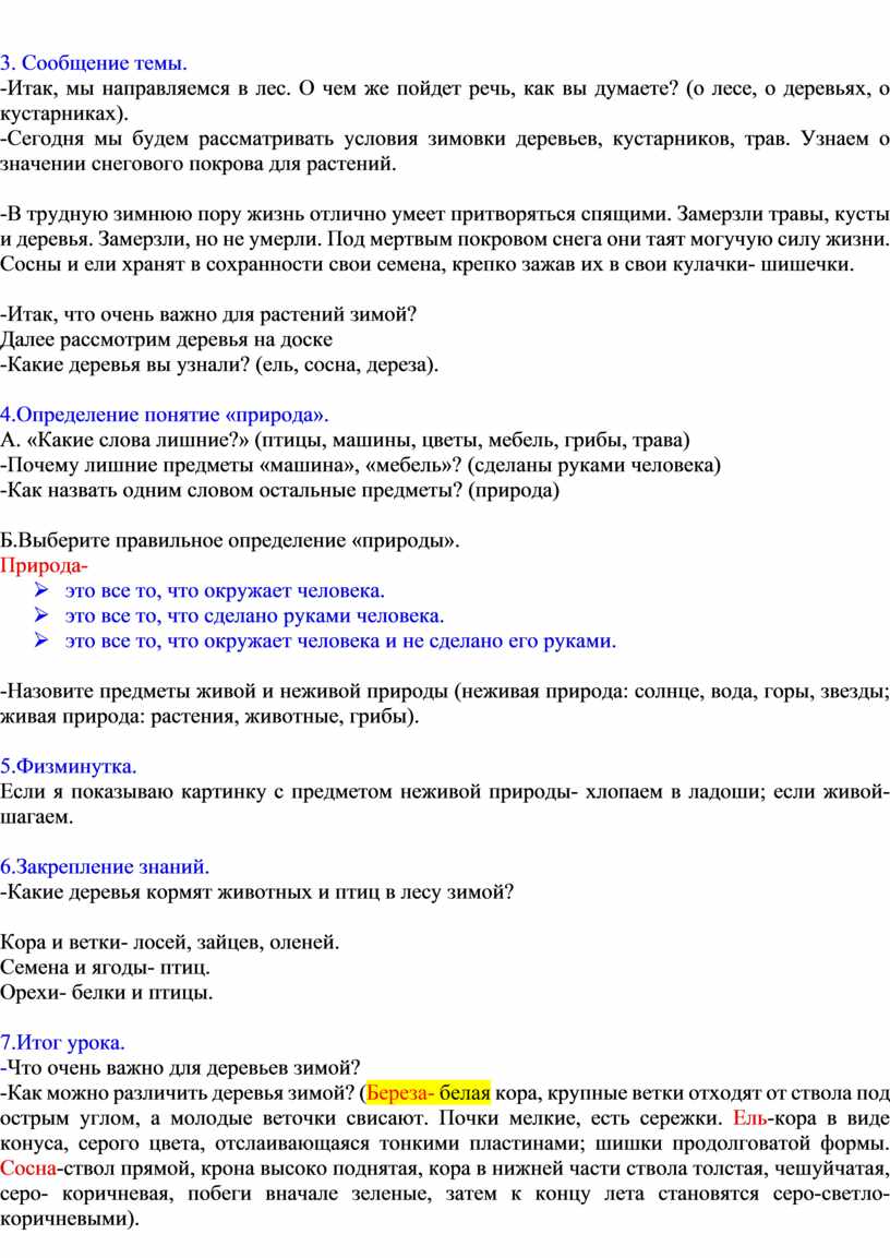 -Как можно различить деревья зимой? (Береза- белая кора, крупные ветки отходят от ствола под острым углом, а молодые веточки свисают. Почки мелкие, есть сережки. Ель-кора в виде конуса, серого цвета, отслаивающаяся тонкими пластинами; шишки продолговатой формы. Сосна-ствол прямой, крона высоко поднятая, кора в нижней части ствола толстая, чешуйчатая, серо- коричневая, побеги вначале зеленые, затем к концу лета становятся серо-светло- коричневыми).