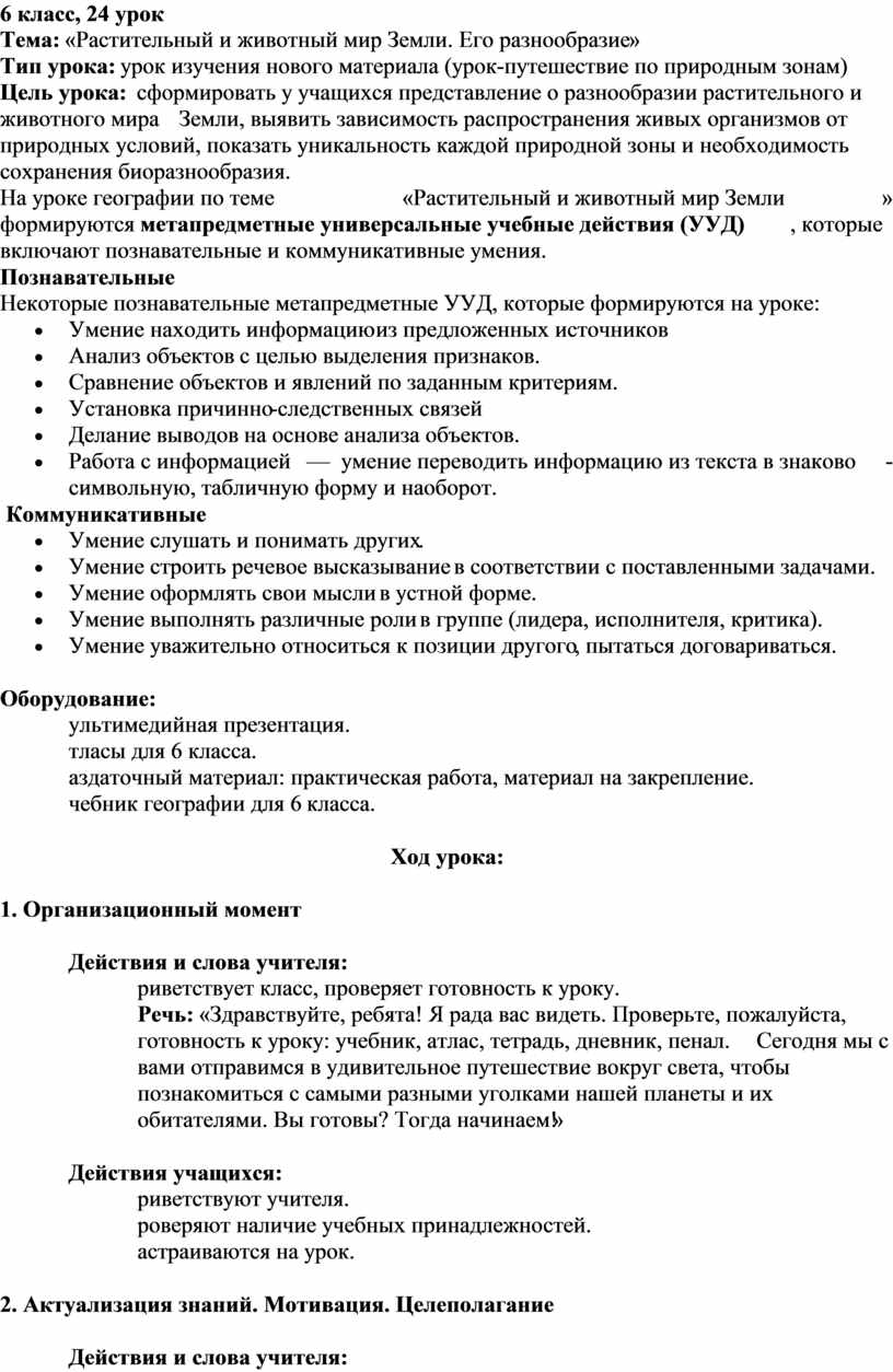 На уроке географии по теме «Растительный и животный мир Земли» формируются метапредметные универсальные учебные действия (УУД), которые включают познавательные и коммуникативные умения.