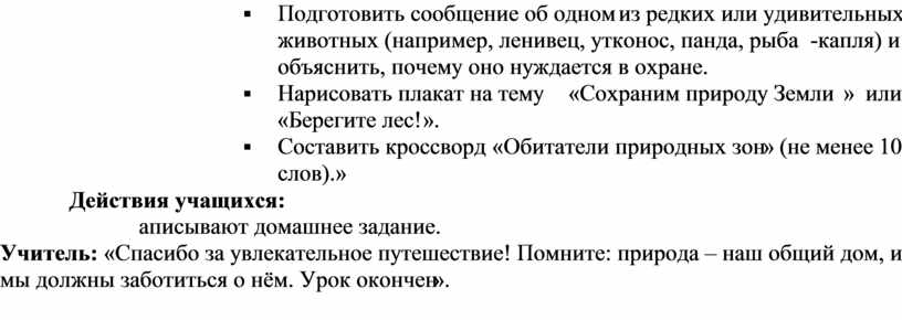 Учитель: «Спасибо за увлекательное путешествие! Помните: природа – наш общий дом, и мы должны заботиться о нём. Урок окончен».