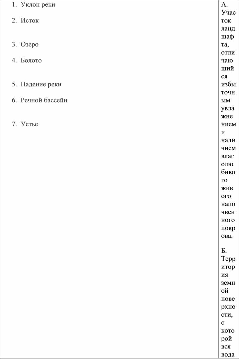 А. Участок ландшафта, отличающийся избыточным увлажнением и наличием влаголюбивого живого напочвенного покрова. Б. Территория земной поверхности, с которой вся вода (и дождевая, и подземная) стекает в эту реку или ее притоки. В. Начало реки. Г. Отношение падения реки (или другого водотока) на каком-либо участке к длине этого участка. Д. Замкнутая котловина, заполненная водой. Е. Разница в абсолютных высотах между её истоком и устьем. Ж. Конечный участок реки, где она впадает в другой водоём, такой как море, озеро, океан, или в другой водоток