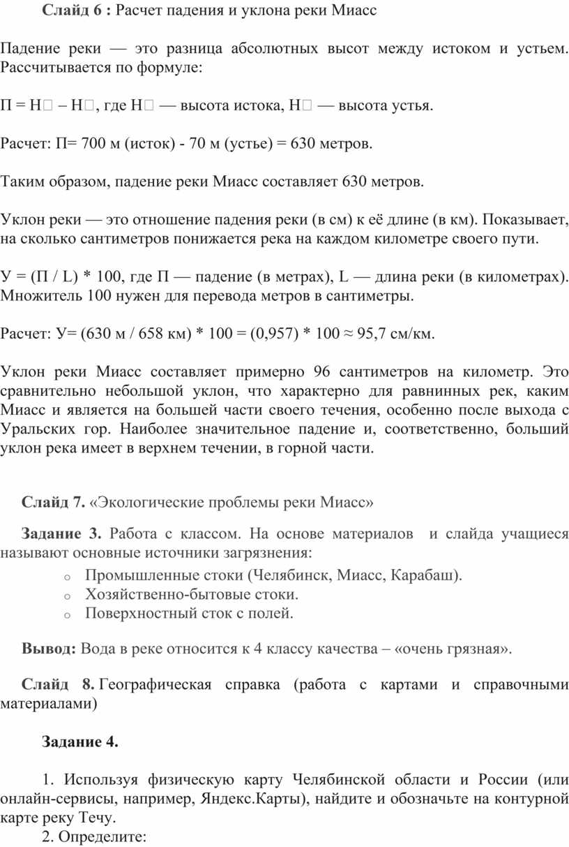 Слайд 6 : Расчет падения и уклона реки Миасс