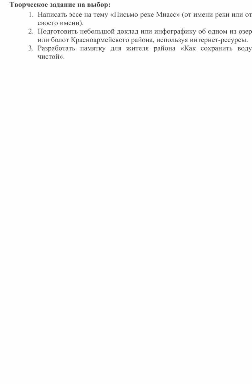 1. Написать эссе на тему «Письмо реке Миасс» (от имени реки или от своего имени).