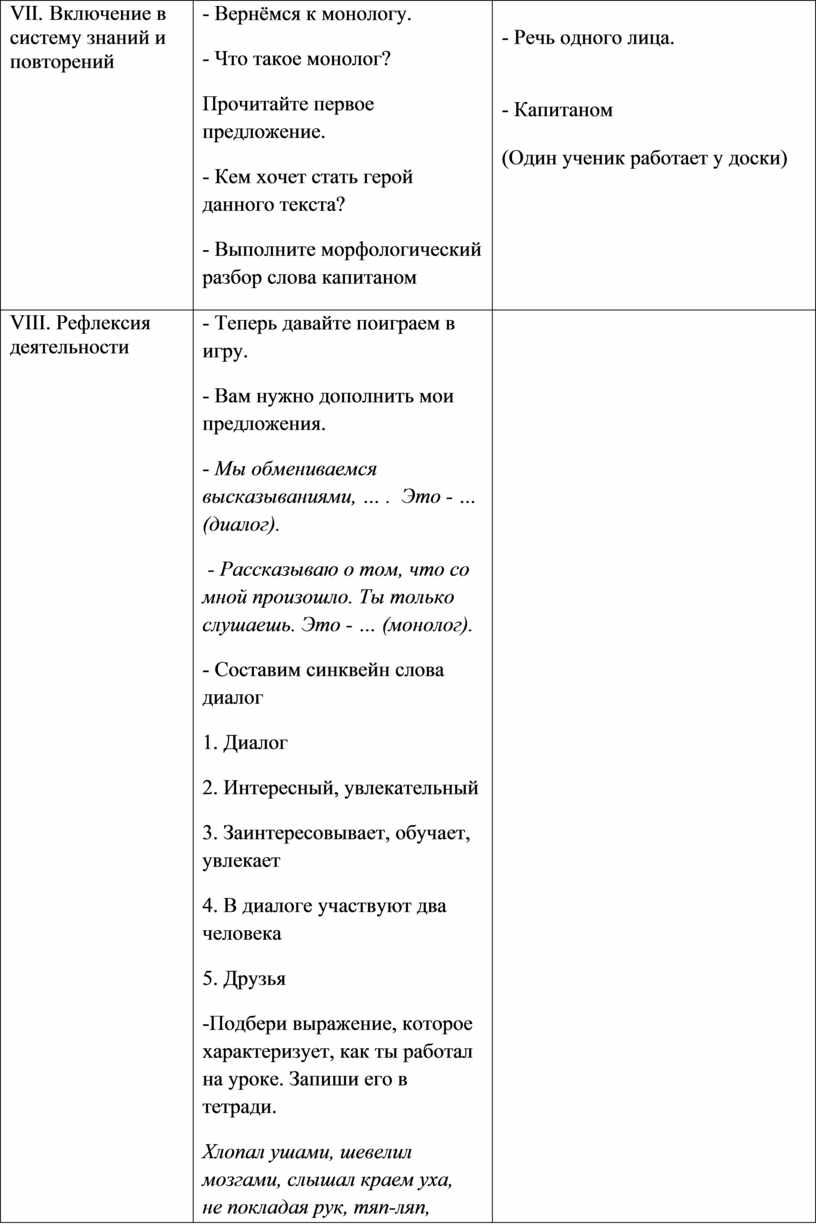 - Теперь давайте поиграем в игру. - Вам нужно дополнить мои предложения. - Мы обмениваемся высказываниями, … . Это - … (диалог). - Рассказываю о том, что со мной произошло. Ты только слушаешь. Это - … (монолог). - Составим синквейн слова диалог 1. Диалог 2. Интересный, увлекательный 3. Заинтересовывает, обучает, увлекает 4. В диалоге участвуют два человека 5. Друзья -Подбери выражение, которое характеризует, как ты работал на уроке. Запиши его в тетради. Хлопал ушами, шевелил мозгами, слышал краем уха, не покладая рук, тяп-ляп, засучив рукава, считал ворон, в поте лица |