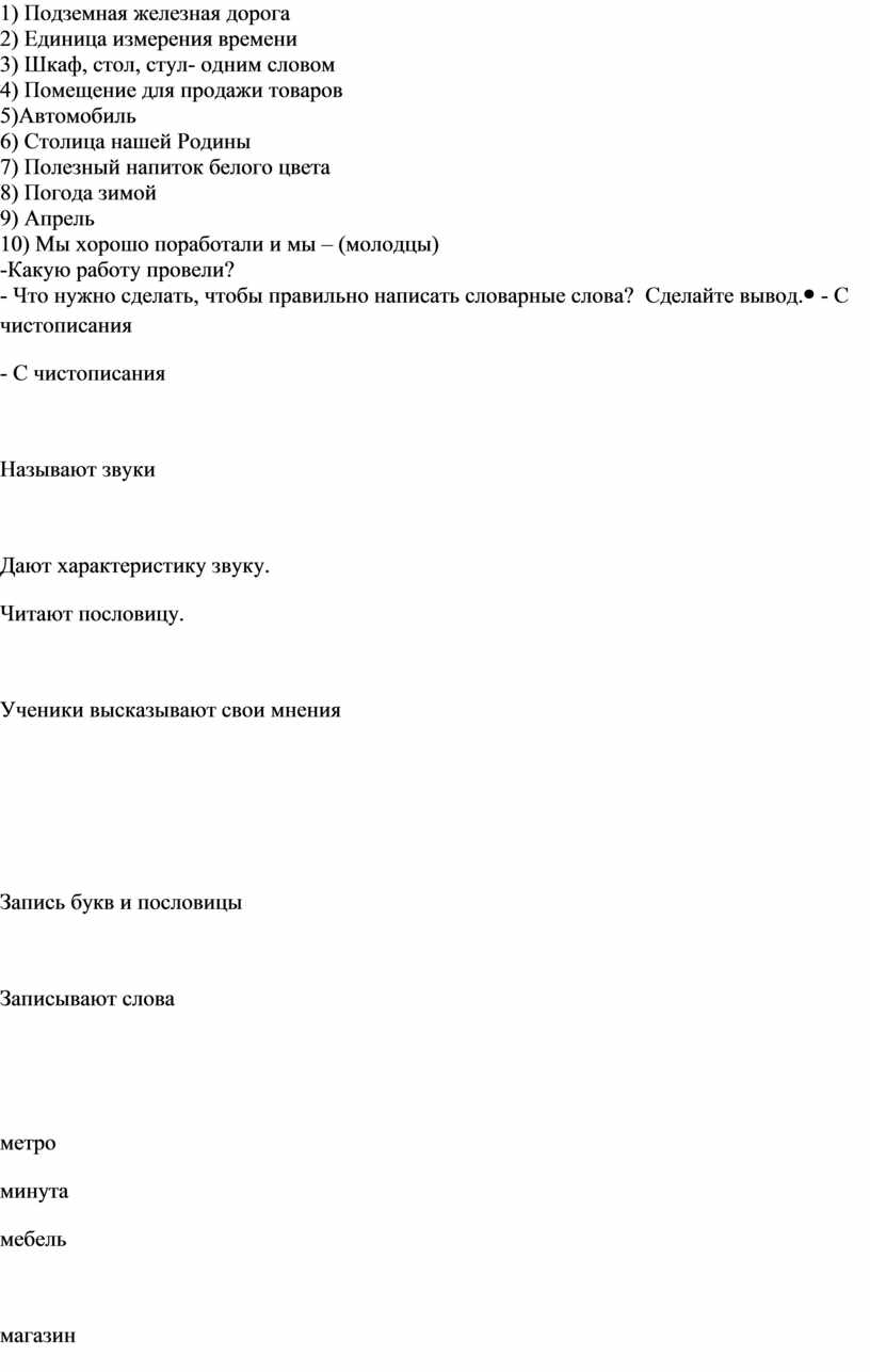- С чего начнём урок? Мм Мм - Какие звуки на письме обозначает данная буква? - Дайте характеристику звукам. - Прочитайте пословицу: Люби дело - мастером будешь. - Кого можно назвать мастером? - Как можно применить данную пословицу к уроку русского языка? - Запишите пословицу в тетрадь. - Продолжим писать слова с буквой эм, соблюдая правила каллиграфического письма - Запишите одним словом 1) Подземная железная дорога 2) Единица измерения времени 3) Шкаф, стол, стул- одним словом 4) Помещение для продажи товаров 5)Автомобиль 6) Столица нашей Родины 7) Полезный напиток белого цвета 8) Погода зимой 9) Апрель 10) Мы хорошо поработали и мы – (молодцы) -Какую работу провели? - Что нужно сделать, чтобы правильно написать словарные слова? Сделайте вывод. |