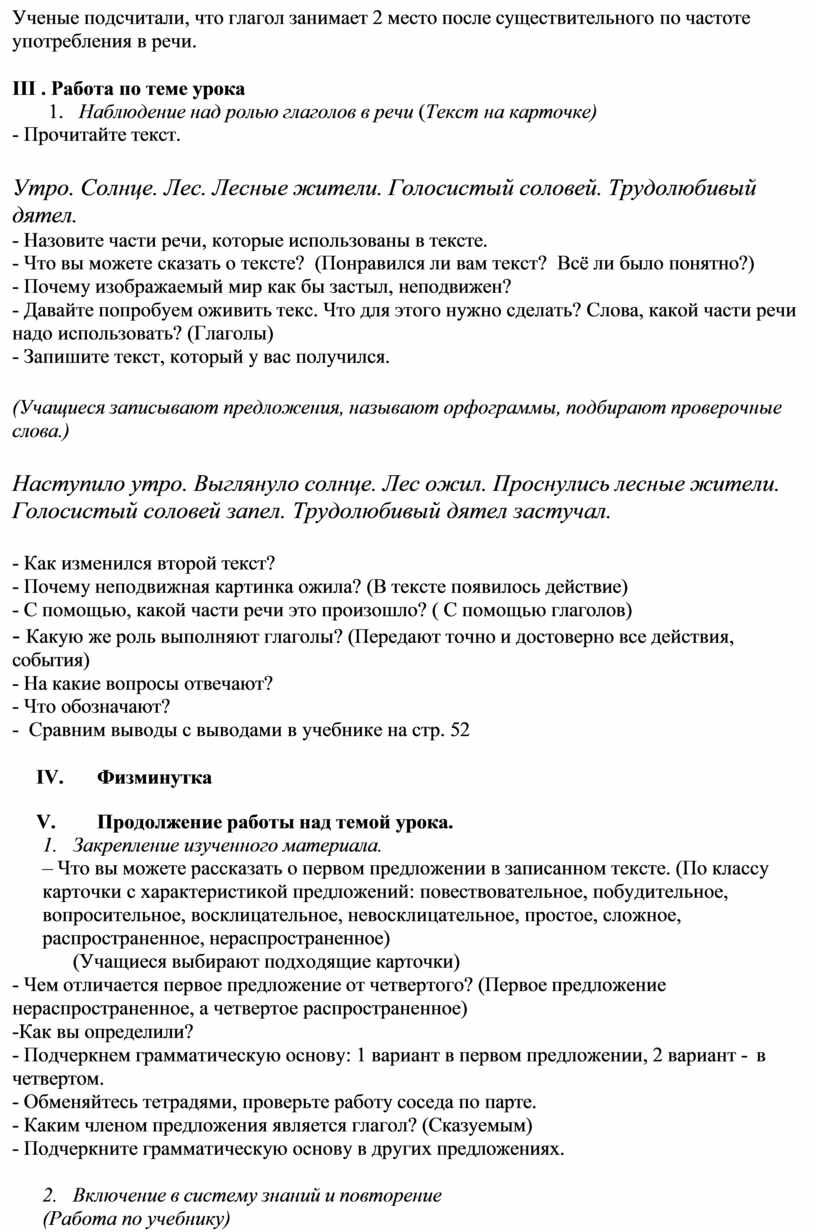 1. Наблюдение над ролью глаголов в речи (Текст на карточке)