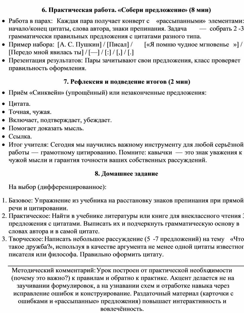 · Итог учителя: Сегодня мы научились важному инструменту для любой серьёзной работы — грамотному цитированию. Помните: кавычки — это знак уважения к чужой мысли и гарантия точности ваших собственных рассуждений.