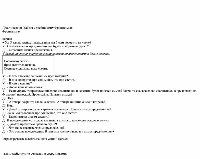 У.: - В чем сходство записанных предложений? Д.: - В них говорится про солнышко, что оно светит. У.: - В чем различие? Д.: - Добавлены новые слова. У.: - Если убрать из предложений слова «солнышко» и «светит» будет понятен смысл? Закройте сначала слово «солнышко» в предложениях бумажной полоской. Прочитайте. Понятен смысл? Д. : Нет. У.: - А теперь закройте слово «светит». А теперь понятно о чем идет речь? Д.: Нет. У.: - Давайте закроем слова «ярко» и «осеннее». Понятен смысл предложения? Д.: Да, в нем говорится про солнышко, что оно светит. У.: - Какой вывод можем сделать? Д.: В предложении есть слова главные, в которых заключена основная мысль У.: -Давайте прочитаем правило стр. 29. У.: - Что такое главные члены предложения? Д.: - Это основа предложения. В главных членах заключен смысл предложения. |