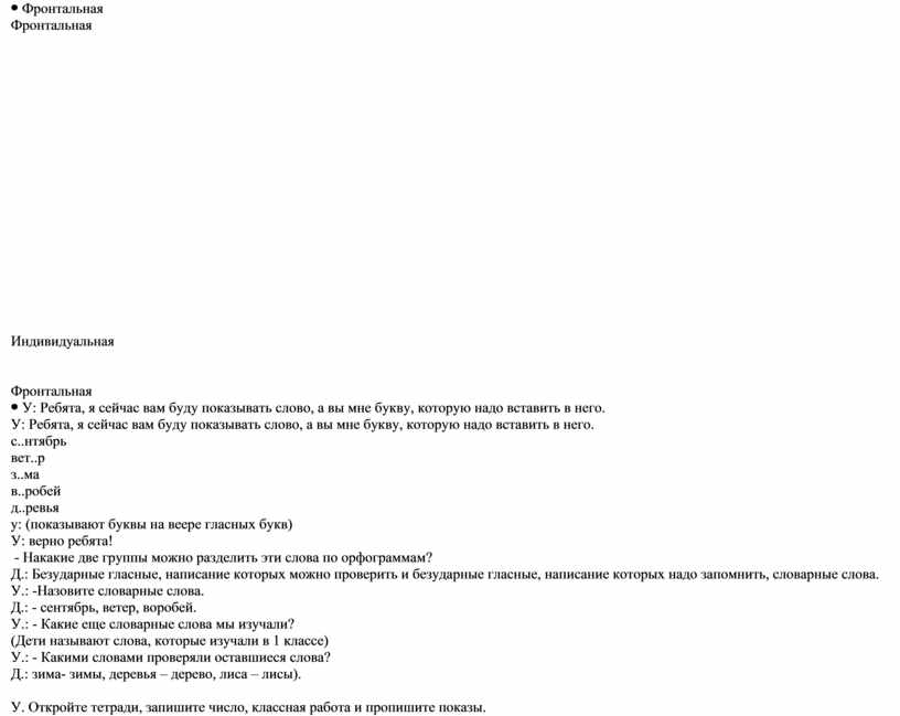 У: Ребята, я сейчас вам буду показывать слово, а вы мне букву, которую надо вставить в него. с..нтябрь вет..р з..ма в..робей д..ревья у: (показывают буквы на веере гласных букв) У: верно ребята! - Накакие две группы можно разделить эти слова по орфограммам? Д.: Безударные гласные, написание которых можно проверить и безударные гласные, написание которых надо запомнить, словарные слова. У.: -Назовите словарные слова. Д.: - сентябрь, ветер, воробей. У.: - Какие еще словарные слова мы изучали? (Дети называют слова, которые изучали в 1 классе) У.: - Какими словами проверяли оставшиеся слова? Д.: зима- зимы, деревья – дерево, лиса – лисы).
