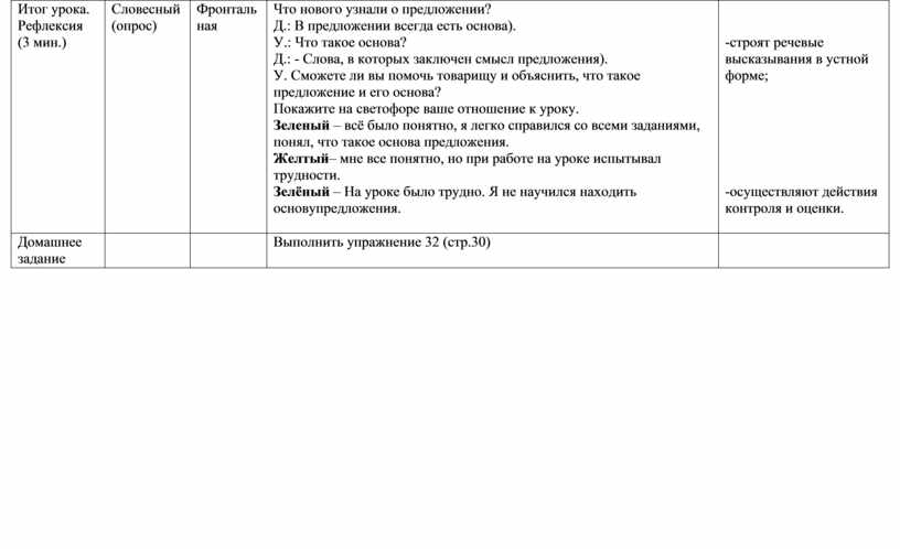 Что нового узнали о предложении? Д.: В предложении всегда есть основа). У.: Что такое основа? Д.: - Слова, в которых заключен смысл предложения). У. Сможете ли вы помочь товарищу и объяснить, что такое предложение и его основа? Покажите на светофоре ваше отношение к уроку. Зеленый – всё было понятно, я легко справился со всеми заданиями, понял, что такое основа предложения. Желтый– мне все понятно, но при работе на уроке испытывал трудности. Зелёный – На уроке было трудно. Я не научился находить основупредложения. |