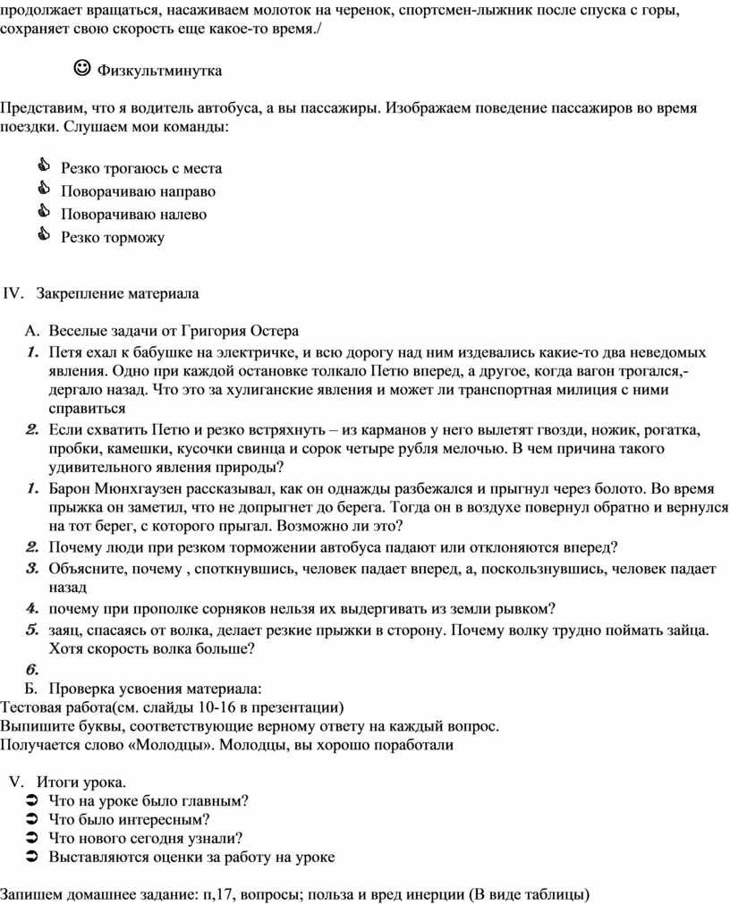 VI. Запишем домашнее задание: п,17, вопросы; польза и вред инерции (В виде таблицы)
