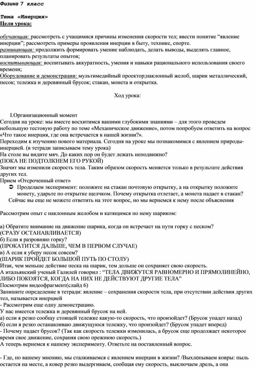 Оборудование и демонстрации: мультимедийный проектор;наклонный желоб, шарик металлический, песок; тележка и деревянный брусок; стакан, монета и открытка.
