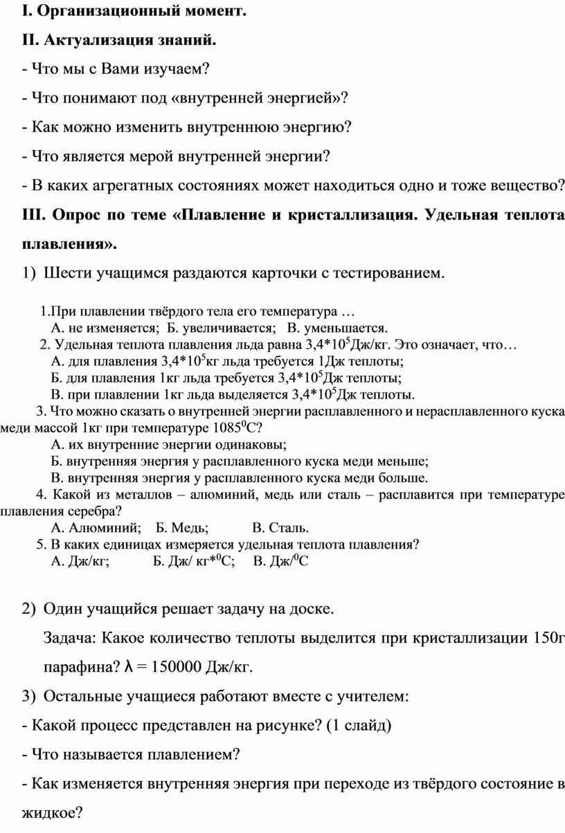 III. Опрос по теме «Плавление и кристаллизация. Удельная теплота плавления».