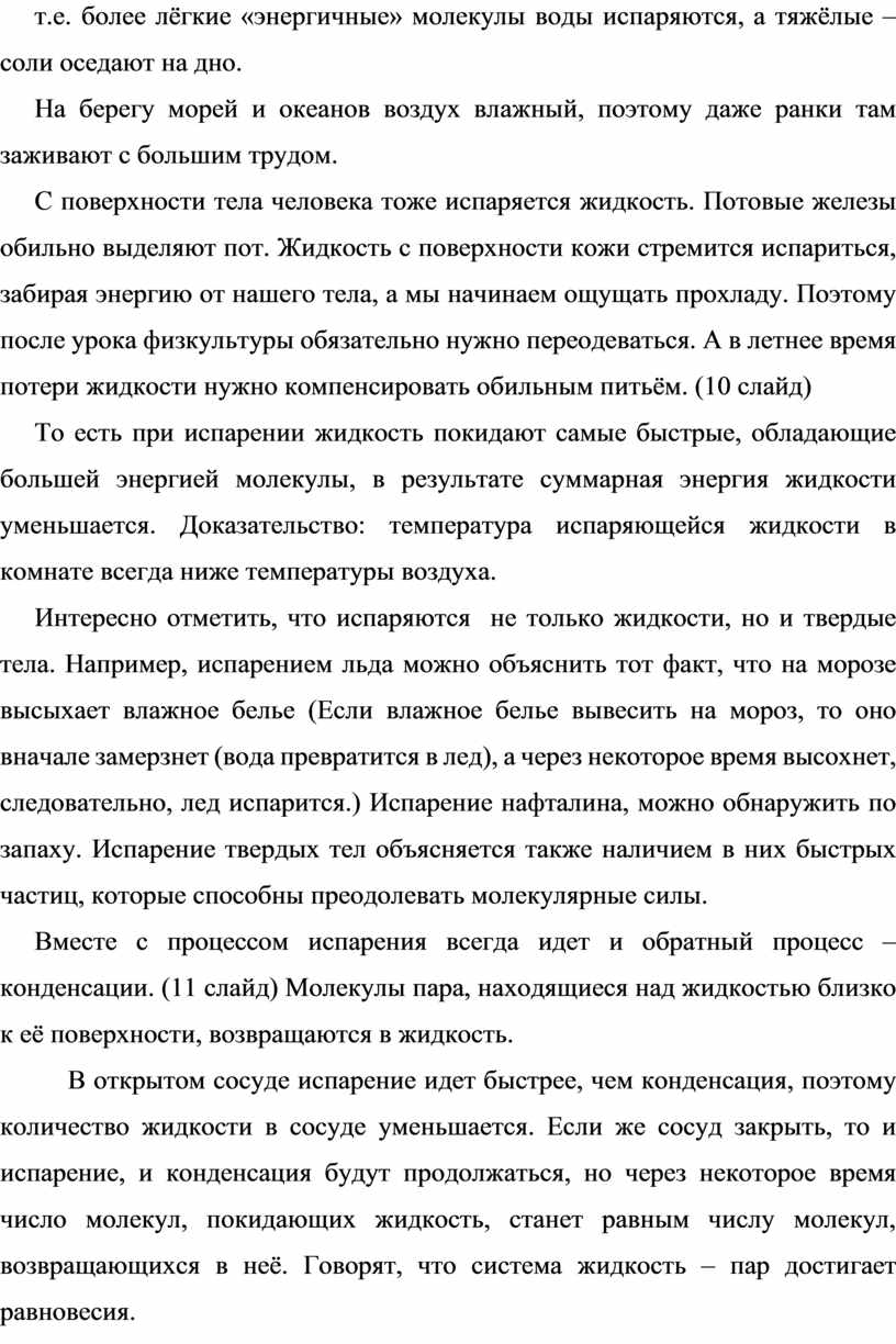 С поверхности тела человека тоже испаряется жидкость. Потовые железы обильно выделяют пот. Жидкость с поверхности кожи стремится испариться, забирая энергию от нашего тела, а мы начинаем ощущать прохладу. Поэтому после урока физкультуры обязательно нужно переодеваться. А в летнее время потери жидкости нужно компенсировать обильным питьём. (10 слайд)