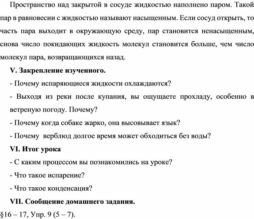 Цели урока: познакомить учащихся с процессами испарения и конденсации; выяснить зависимость скорости испарения от внешних факторов; продолжить формирование умения наблюдать, характеризовать физические явления, делать выводы; способствовать развитию навыков выполнения эксперимента.