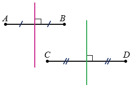Если отрезки AB и CD не параллельны и не пересекаются (или пересекаются не в середине каждого из отрезков) то, чтобы построить точку М такую, что МА = МВ и МС = MD, нужно построить серединные перпендикуляры к каждому из данных отрезков и найти их точку пересечения, которая и будет искомой точкой.