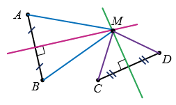 Каждая точка серединного перпендикуляра к отрезку равноудалена от концов этого отрезка. Тогда возможны 4 случая расположения точки М в зависимости от расположения отрезков АВ и СD: