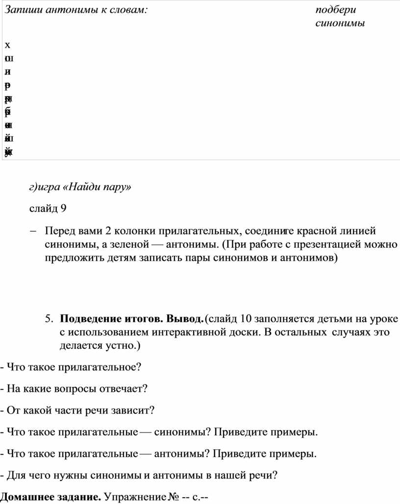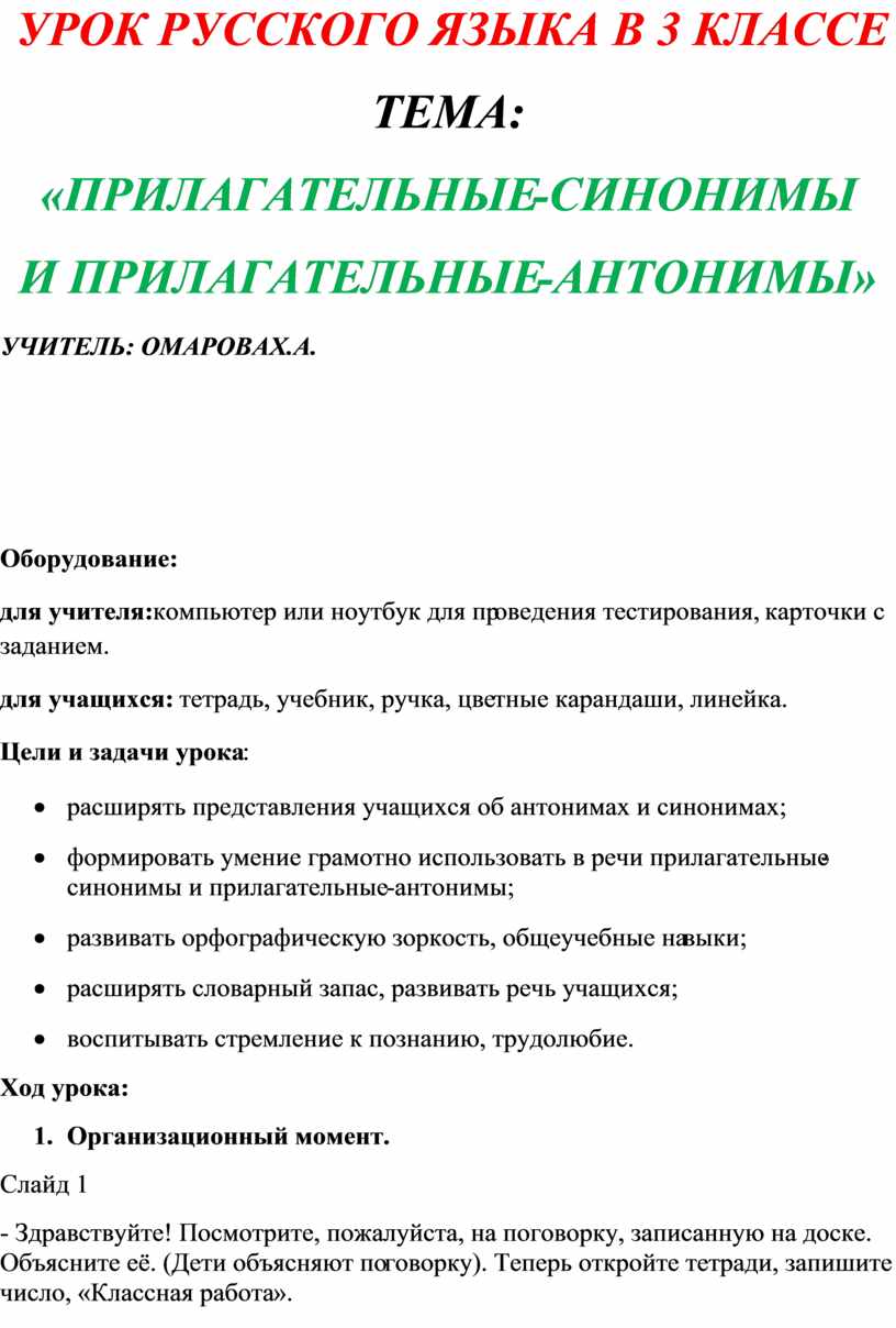 -Итак, тема нашего урока — прилагательные — синонимы и прилагательные — антонимы.