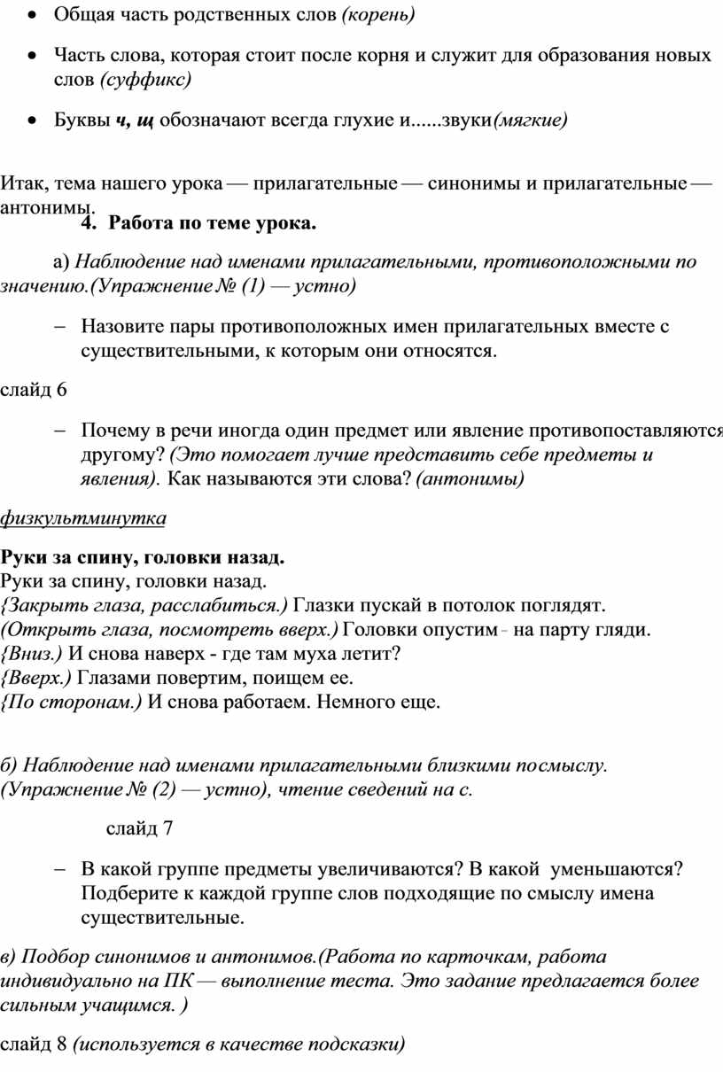 б) Наблюдение над именами прилагательными близкими по смыслу. (Упражнение № (2) — устно), чтение сведений на с.
