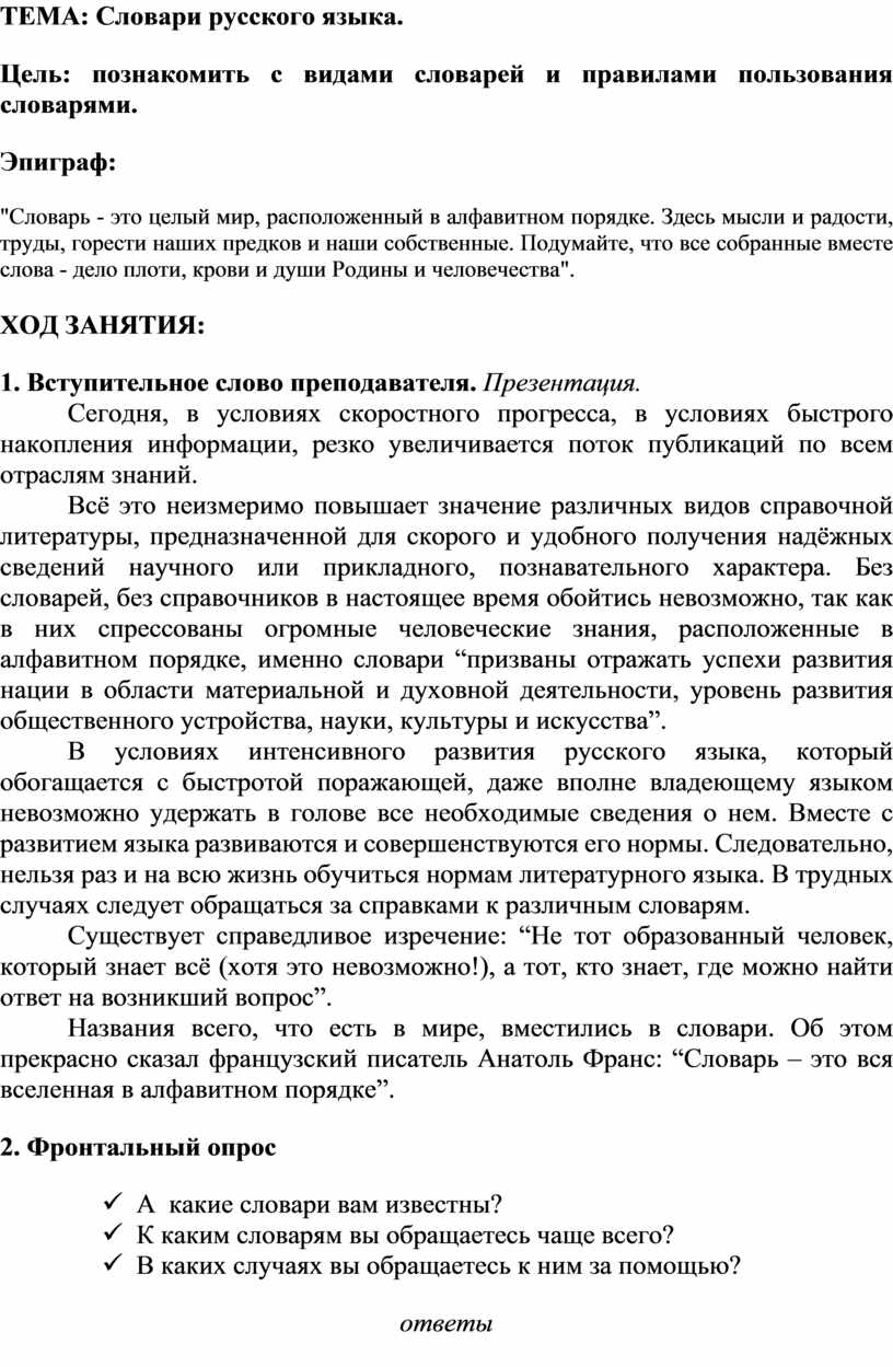 Цель: познакомить с видами словарей и правилами пользования словарями.