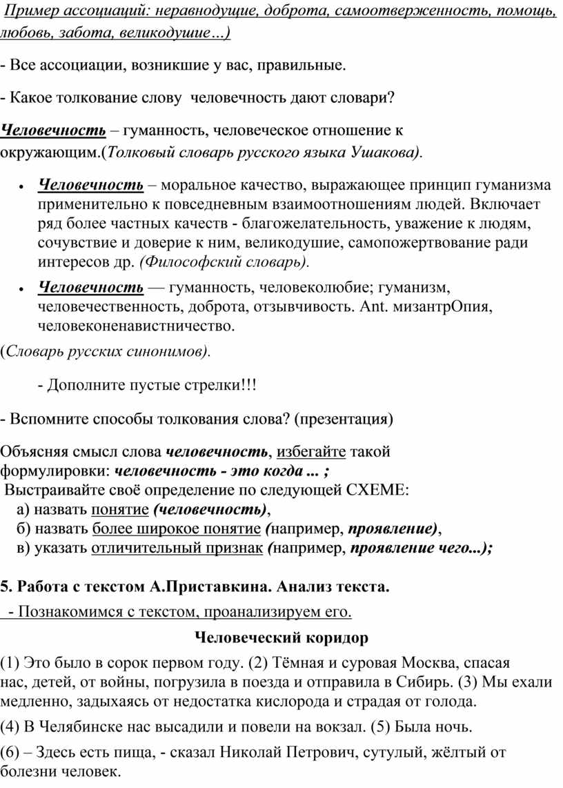 Оборудование: компьютер, видеопроектор, печатные листы с текстом А. И. Приставкина “Человеческий коридор”, карточки с афоризмами, «Толковые словари».
