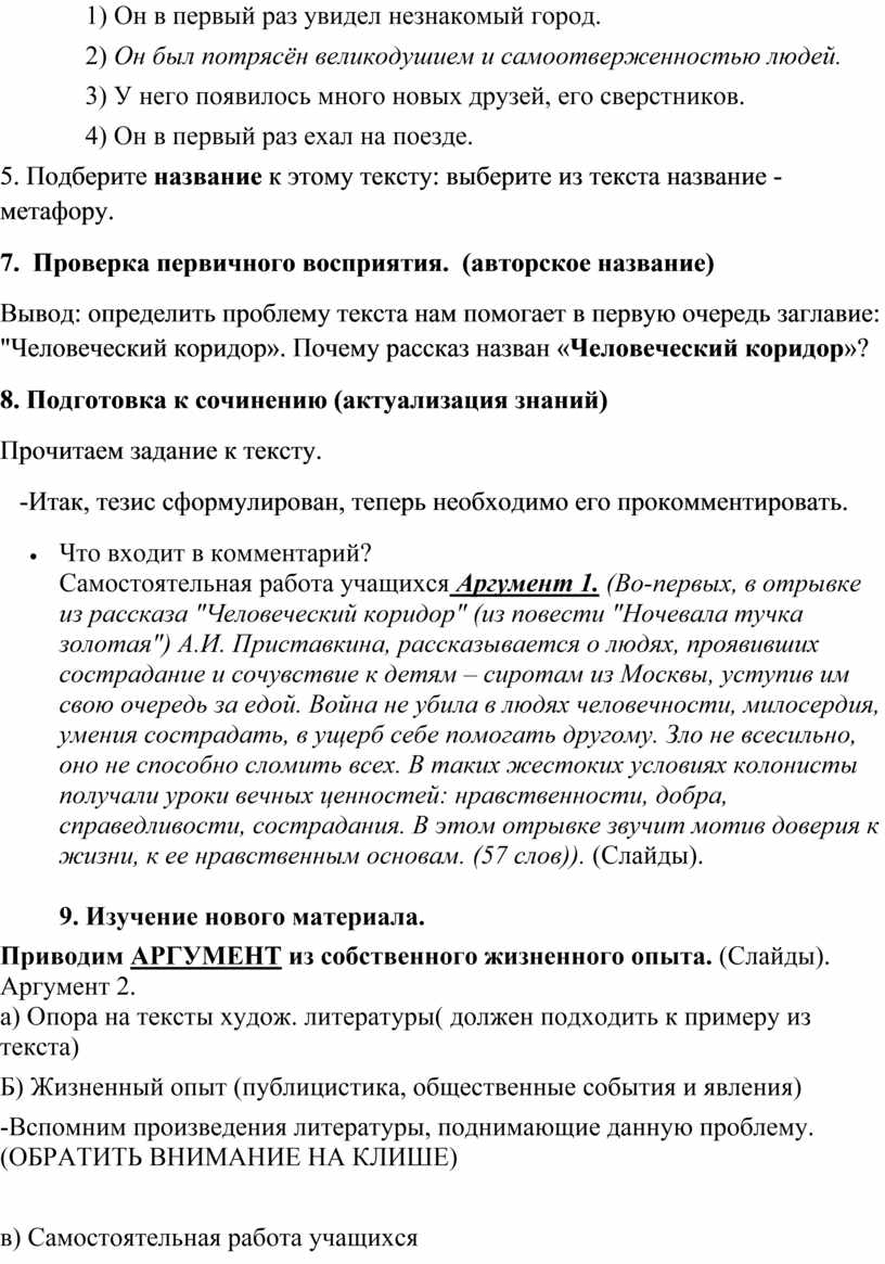 Самостоятельная работа учащихся Аргумент 1. (Во-первых, в отрывке из рассказа "Человеческий коридор" (из повести "Ночевала тучка золотая") А.И. Приставкина, рассказывается о людях, проявивших сострадание и сочувствие к детям – сиротам из Москвы, уступив им свою очередь за едой. Война не убила в людях человечности, милосердия, умения сострадать, в ущерб себе помогать другому. Зло не всесильно, оно не способно сломить всех. В таких жестоких условиях колонисты получали уроки вечных ценностей: нравственности, добра, справедливости, сострадания. В этом отрывке звучит мотив доверия к жизни, к ее нравственным основам. (57 слов)). (Слайды).