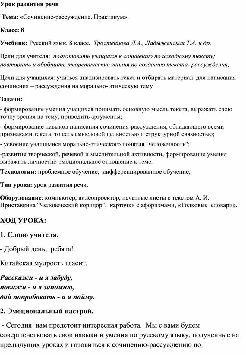 Цели для учителя: подготовить учащихся к сочинению по исходному тексту; повторить и обобщить теоретические знания по созданию текста- рассуждения;