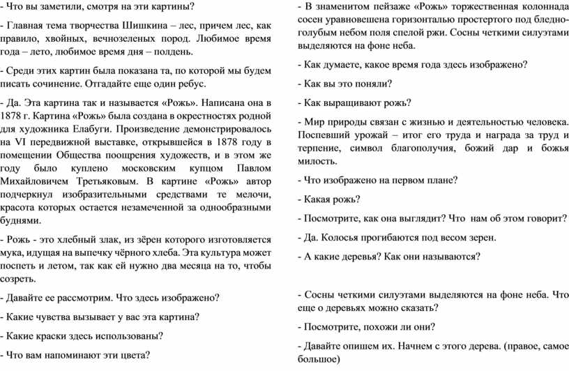 - Давайте сначала пополним наши знания о творчестве Иване Ивановиче Шишкине. БИОГРАФИЯ ШИШКИНА - Посмотрим некоторые его работы. (Видео) - Что вы заметили, смотря на эти картины? - Главная тема творчества Шишкина – лес, причем лес, как правило, хвойных, вечнозеленых пород. Любимое время года – лето, любимое время дня – полдень. - Среди этих картин была показана та, по которой мы будем писать сочинение. Отгадайте еще один ребус. - Да. Эта картина так и называется «Рожь». Написана она в 1878 г. Картина «Рожь» была создана в окрестностях родной для художника Елабуги. Произведение демонстрировалось на VI передвижной выставке, открывшейся в 1878 году в помещении Общества поощрения художеств, и в этом же году было куплено московским купцом Павлом Михайловичем Третьяковым. В картине «Рожь» автор подчеркнул изобразительными средствами те мелочи, красота которых остается незамеченной за однообразными буднями. - Рожь - это хлебный злак, из зёрен которого изготовляется мука, идущая на выпечку чёрного хлеба. Эта культура может поспеть и летом, так как ей нужно два месяца на то, чтобы созреть. - Давайте ее рассмотрим. Что здесь изображено? - Какие чувства вызывает у вас эта картина? - Какие краски здесь использованы? - Что вам напоминают эти цвета? - В знаменитом пейзаже «Рожь» торжественная колоннада сосен уравновешена горизонталью простертого под бледно-голубым небом поля спелой ржи. Сосны четкими силуэтами выделяются на фоне неба. - Как думаете, какое время года здесь изображено? - Как вы это поняли? - Как выращивают рожь? - Мир природы связан с жизнью и деятельностью человека. Поспевший урожай – итог его труда и награда за труд и терпение, символ благополучия, божий дар и божья милость. - Что изображено на первом плане? - Какая рожь? - Посмотрите, как она выглядит? Что нам об этом говорит? - Да. Колосья прогибаются под весом зерен. - А какие деревья? Как они называются?