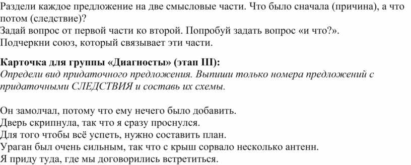o Задание: Даны СПП. Определить вид придаточного, задав вопрос. Выписать только предложения с придаточными следствия, составить их схемы.
