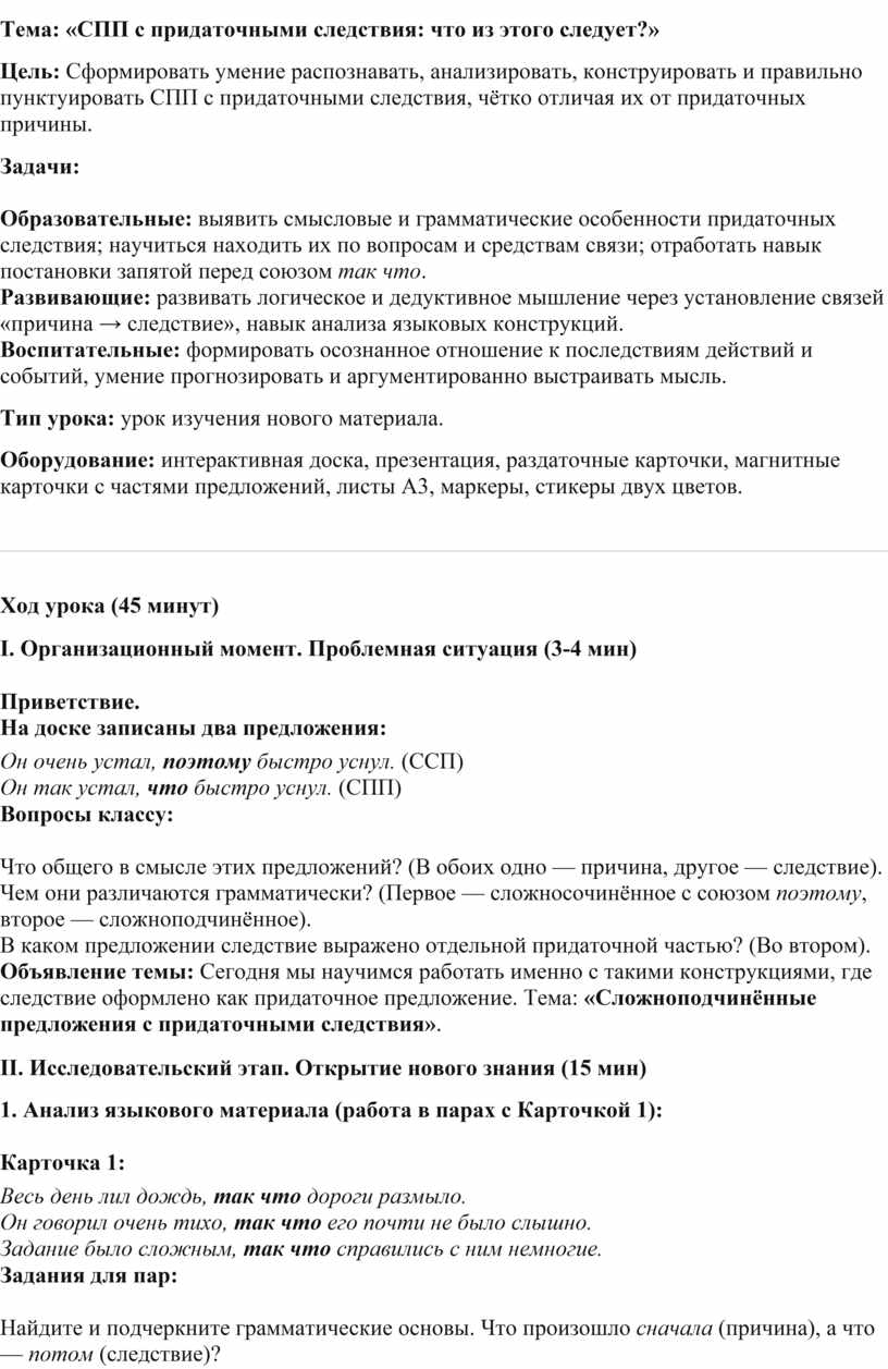 Цель: Сформировать умение распознавать, анализировать, конструировать и правильно пунктуировать СПП с придаточными следствия, чётко отличая их от придаточных причины.