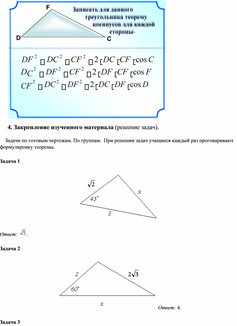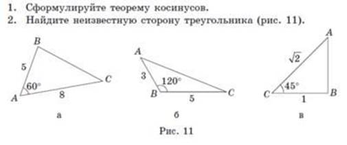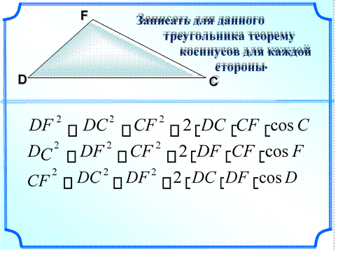 Ц е л и : создать условия для доказательства теоремы косинусов; способствовать развитию умения