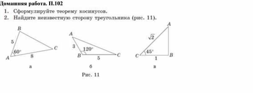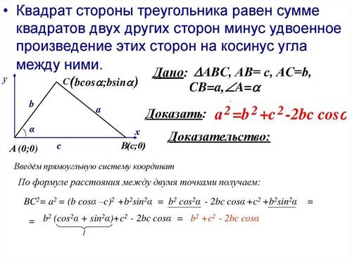 Квадрат стороны треугольника равен сумме квадратов двух других сторон минус удвоенное произведение этих сторон на косинус угла между ними.