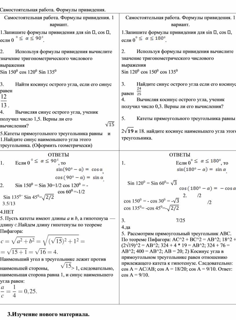 если 0 2. Используя формулы привидения вычислите значение тригонометрического числового выражения Sin 1500 cos 1200 Sin 1350 3. Найти косинус острого угла, если его синус равен