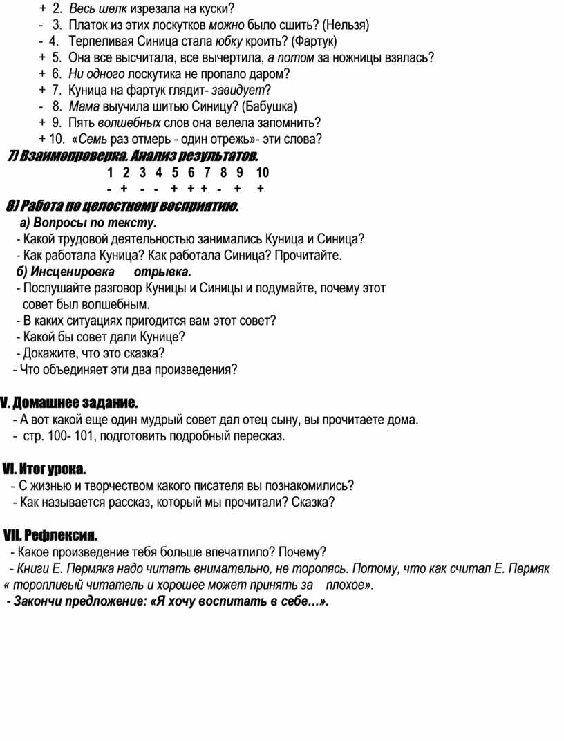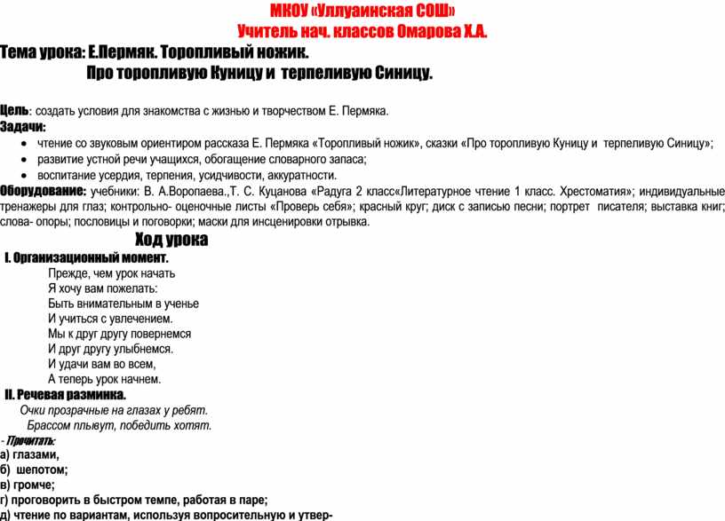 по теме: «Е.Пермяк. Торопливый ножик. Про торопливую Куницу и терпеливую Синицу»