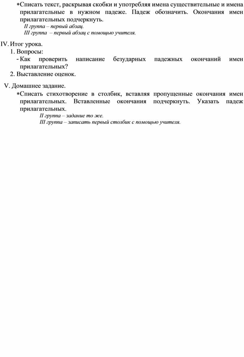 1. Способствовать развитию умения учащихся проверять написание падежных окончаний имен прилагательных с помощью вопроса. 2. Способствовать активизации и обогащению словаря прилагательных; корригировать зрительное восприятие, словесно-логическое мышление через работу над упражнениями урока. 3. Способствовать развитию самоконтроля и самоорганизации при выполнении письменных заданий урока. |