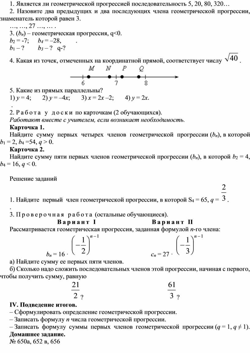 – Записать формулу суммы первых членов геометрической прогрессии (q = 1, q ≠ 1).