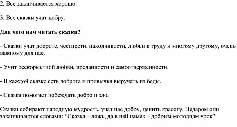 Сказки собирают народную мудрость, учат нас добру, ценить красоту. Недаром они заканчиваются словами: “Сказка – ложь, да в ней намек – добрым молодцам урок”