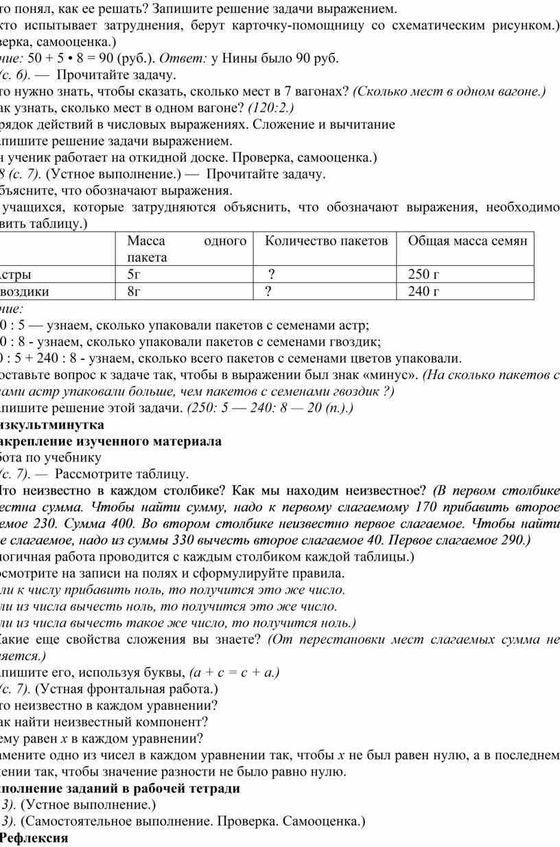 Цели: актуализировать знания об основных арифметических действиях (сложение, вычитание, умножение, деление), о связи между компонентами и результатами этих действий; повторить правила порядка выполнения действий в выражениях; совершенствовать вычислительные навыки, умение решать задачи.