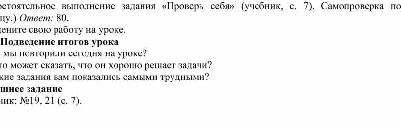 (Самостоятельное выполнение задания «Проверь себя» (учебник, с. 7). Самопроверка по образцу.) Ответ: 80.