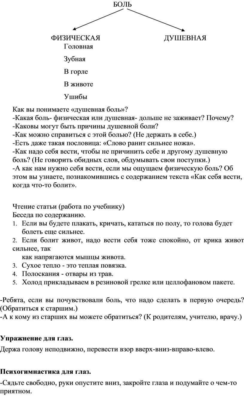 1. Дать понятие боли, познакомить с правилами поведения, когда мы ощущаем боли, разграничить боль но видам.