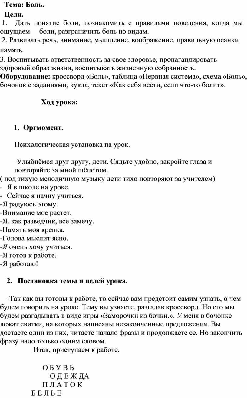 Оборудование: кроссворд «Боль», таблица «Нервная система», схема «Боль», бочонок с заданиями, кукла, текст «Как себя вести, если что-то болит».